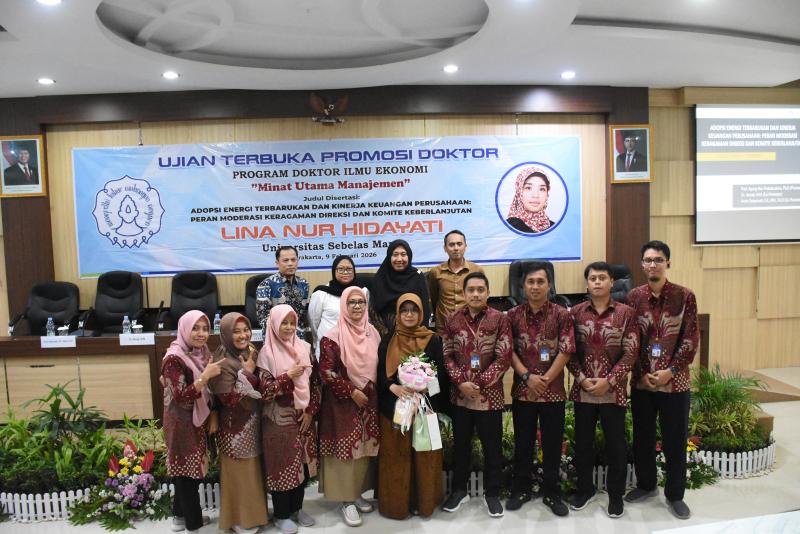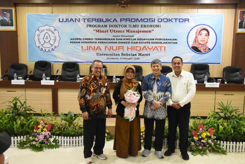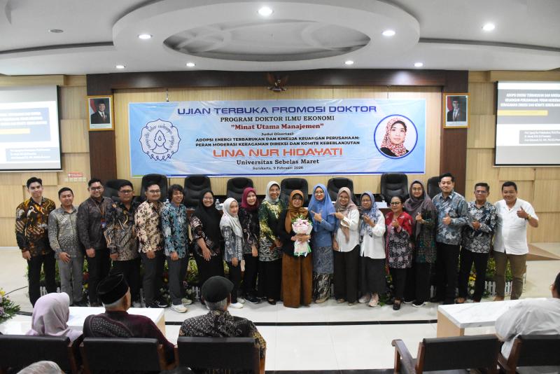Lina Nur Hidayati, M.M., dosen Departemen Manajemen Fakultas Ekonomi dan Bisnis Universitas Negeri Yogyakarta (FEB UNY), resmi menyandang gelar doktor pada Senin (9/2/2026). Gelar tertinggi akademik tersebut diraih setelah ia berhasil mempertahankan disertasinya dalam Ujian Terbuka Program Studi S3 Ilmu Ekonomi Minat Manajemen di Ruang Konimex, Gedung FEB Universitas Sebelas Maret (UNS).